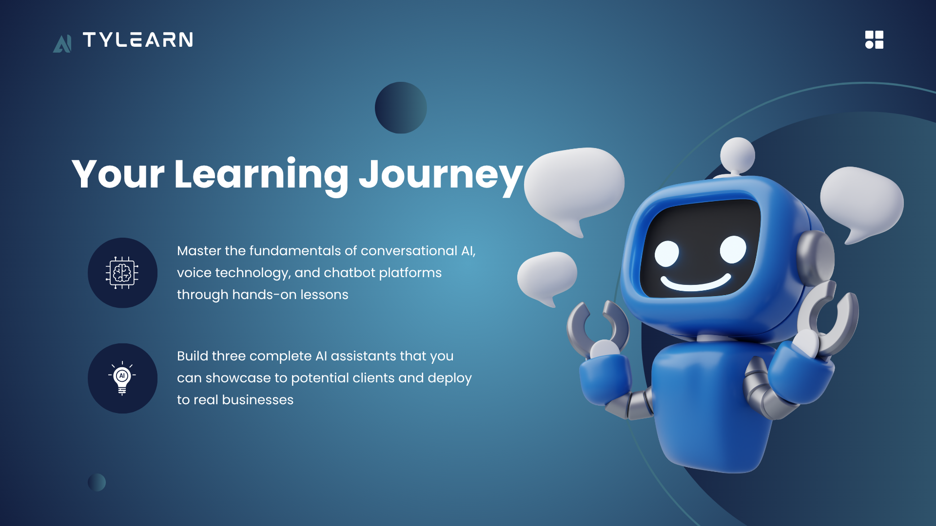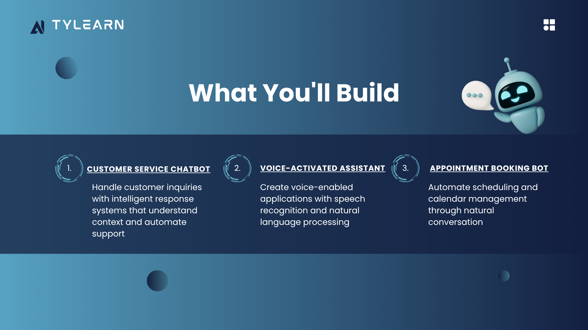 - Conversational AI Mastery - Master platforms and APIs to build chatbots that understand context, handle multiple intents, and provide natural interactions.